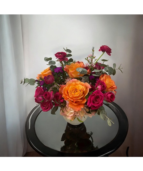 Includes coral-orange roses, hot pink spray roses, hot pink ranunculus, purple dianthus, and eucalyptus in a pink hydrangea base in a white bowl.