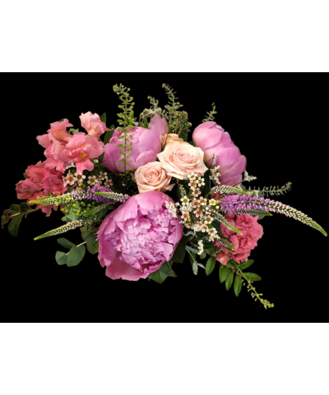 Peonies, spray roses, seasonal filler, snap dragons, and Veronica.