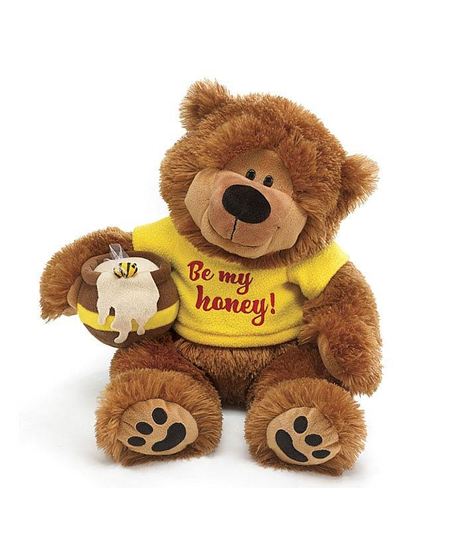 Brown Bear with yellow t-shirt. "Be My Honey" message on t-shirt in red and holding a honey jar with a yellow bee. Easy tie ribbon loop.