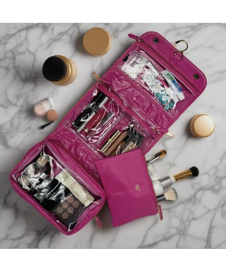 Our Fuchsia Velvet is a beautiful way to add sophistication to your organization. Our classic Hanging Toiletry Case is perfect for travel – keep your toiletries secure and beautifully organized. With the top folding hanger, your items are easily visible and accessible, no matter where your travels take you. All pockets have a clear view design, allowing you to effortlessly admire your essentials without the need to unzip. Additionally, the bottom pocket includes a removable zipper pouch for added storage capacity.
