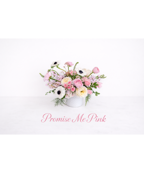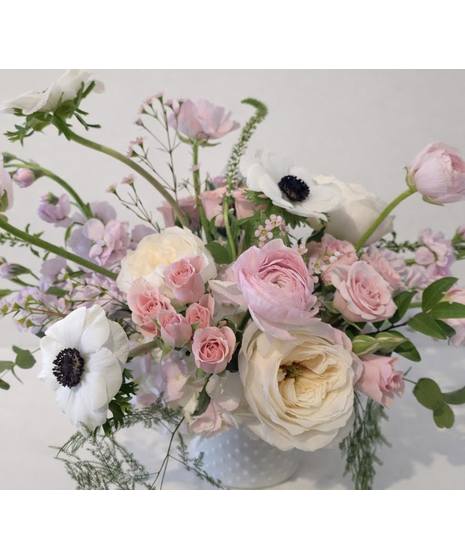 Featuring anemones, ranunculus, spray roses, hydrangeas, garden roses, stock, Veronica and wax flower in a white hobnail milk glass vase as shown. Approx 10” tall x 12” wide.