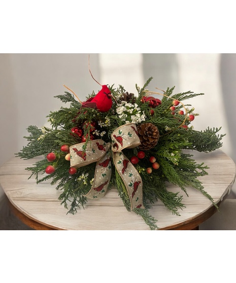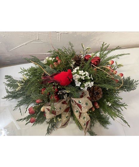 A red bird arrangement includes pine cones, red berries, red bird ribbon, red Christmas balls, accents of fillers and Christmas greenery in a white birch bark container. Measures 18” x 12”.