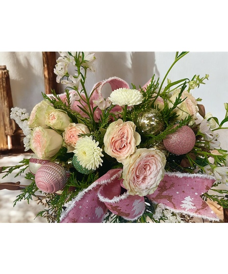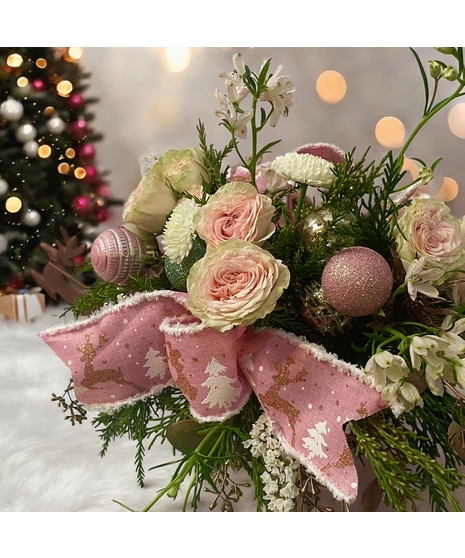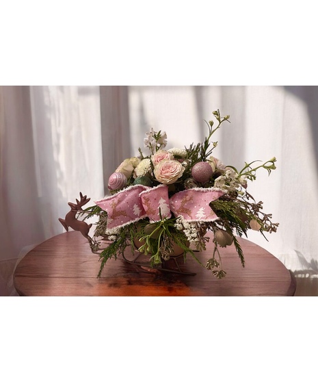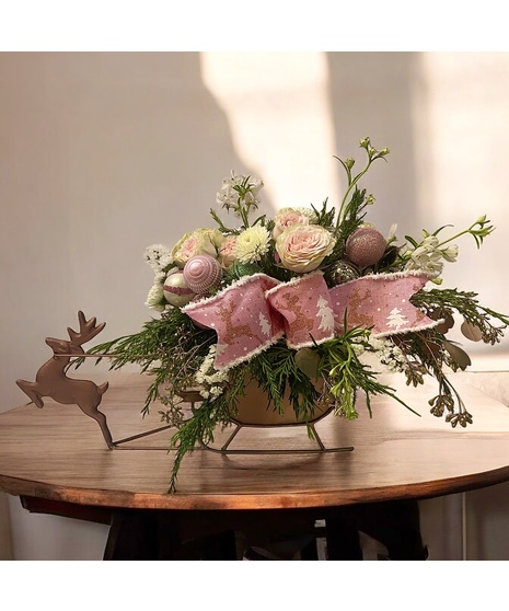 Our exclusive copper reindeer with sleigh centerpiece is sure to delight all. Features long lasting evergreens, garden spray roses, and fillers, reindeer ribbon accent and small Christmas ornaments.