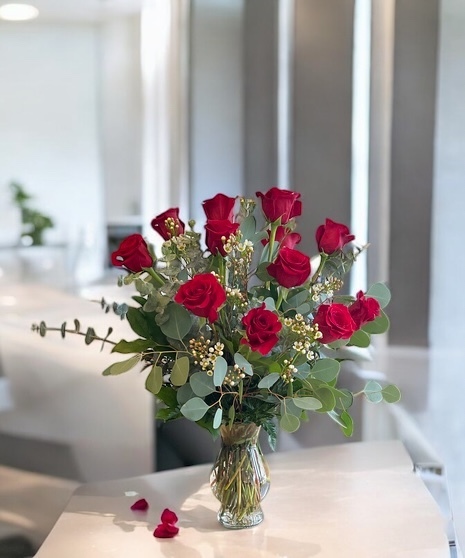 Dozen long stem red roses arranged with premium greenery and seasonal premium filler in the glass vase.
