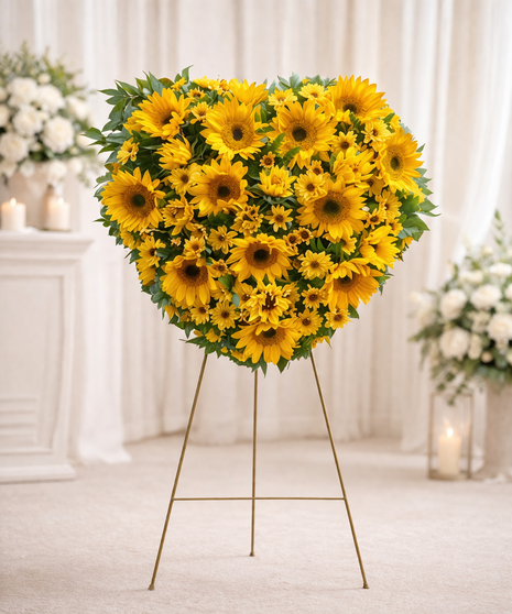 Includes Sunflowers and Viking mums with elegant foliage in a standing heart design on an easel.