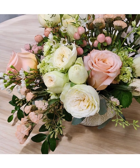 Features spray roses, roses, hypericum, mini green hydrangea and seasonal fillers in a ceramic vase.