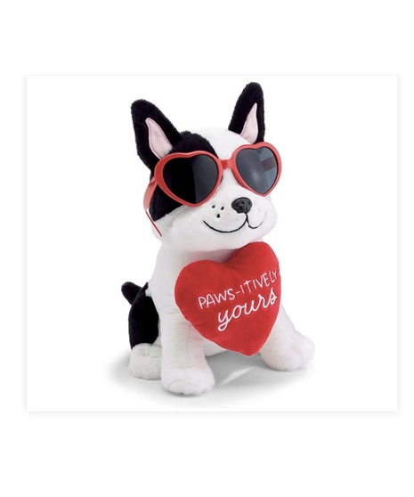 Plush white and black Boston terrier with red heart and red heart sunglasses. Message on heart pillow reads, "Paws-itively Yours".