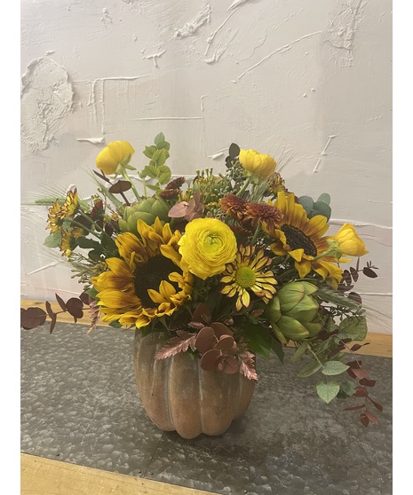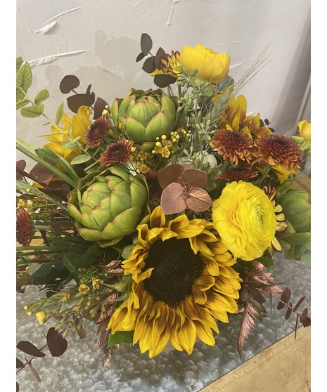 Tuscan Harvest as shown is a medium size arrangement featuring ranunculus, sunflowers, mums and seasonal fillers with artichokes.