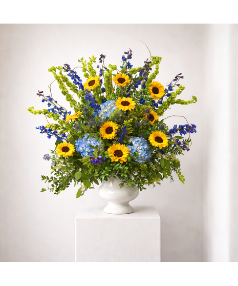 A beautiful arrangement with sunflowers, Blue delphinium, blue hydrangea, bells of Ireland, yellow and blue fillers in an urn. This is one sided—measures 36" tall (not including the curly willow). Make a very large statement