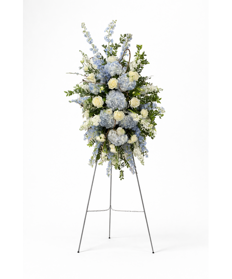 Fresh-cut white and blue flowers are arranged beautifully into a standing spray. The softness of white and blue petals is accentuated by rich greenery. Features beautiful blue delphinium, roses, and hydrangea.